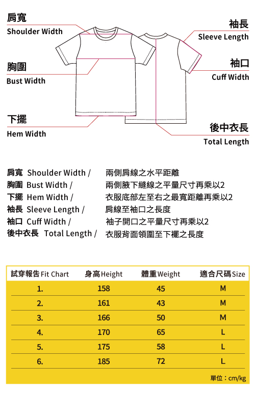 | Cotton Tee | Total Length | Sleeve Length | Cuff Width (Shirt) | Shoulder Width | Bust | Hem Width |